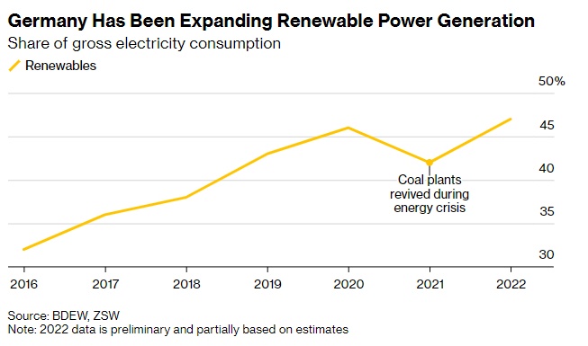 德国一直在扩大可再生能源发电——占总用电量的比例