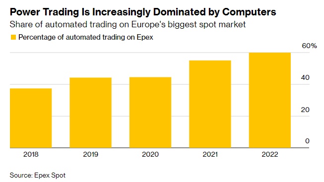 据了解,去年MFT近一半的电力交易是通过各种算法完成,而且这一趋势比例还在上升。在欧洲最大的短期电力交易所巴黎Epex Spot SE,去年自动化电力交易占交易总量的60%,高于2021年的55%。