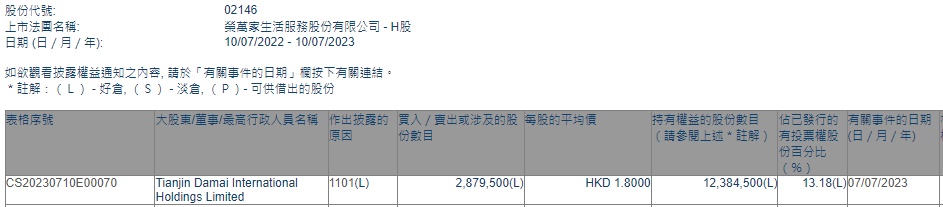 Limited增持荣万家(02146)287.95万股,每股作价1.8港元,总金额为518.31万港元。增持后最新持股数目为1238.45万股,最新持股比例为13.18%。