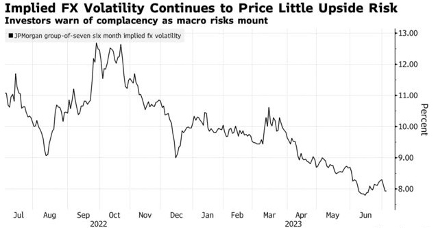智通财经获悉,外汇市场最近趋于平静、波动开始变小,这使得对冲策略的维持成本过高。随着各大央行的鹰派论调持续,全球经济增长仍保持惊人的弹性,投资者购买期权以保护自己免受波动的影响,但市场动荡的情况尚未出现。汇率波动已被压制,试图把握其回归的时间策略也未能成功。摩根大通追踪七国集团(G7)货币六个月隐含波动率的指数显示,该指数徘徊在一年多来的最低水平附近。