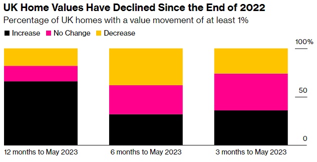 彭博经济学家Niraj Shah在报告中写道:“英国房地产市场的调整还有很长的路要走。政策收紧的速度为自上世纪80年代以来最快,抵押贷款利率持续走高,实际收入停滞不前,这意味着房地产价格的缓慢下跌可能会持续下去。”