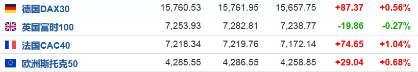 2.截至发稿,德国DAX指数涨0.56%,英国富时100指数跌0.27%,法国CAC40指数涨1.04%,欧洲斯托克50指数涨0.68%。