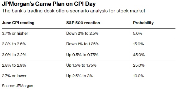 该团队预测的最有可能的情况是,CPI涨幅在3%至3.2%之间,标普500指数上涨0.5%至0.75%。如果通胀率达到或低于2.7%,预计将引发基准股指至少上涨2.5%。