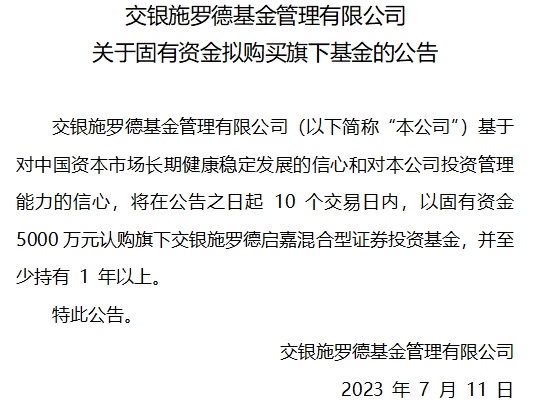7月11日,交银施罗德基金发布公告称,基于对中国资本市场长期健康稳定发展的信心和对公司投资管理能力的信心,将在公告之日起10个交易日内,以固有资金5000万元认购旗下交银施罗德启嘉混合型证券投资基金,并至少持有1年以上。