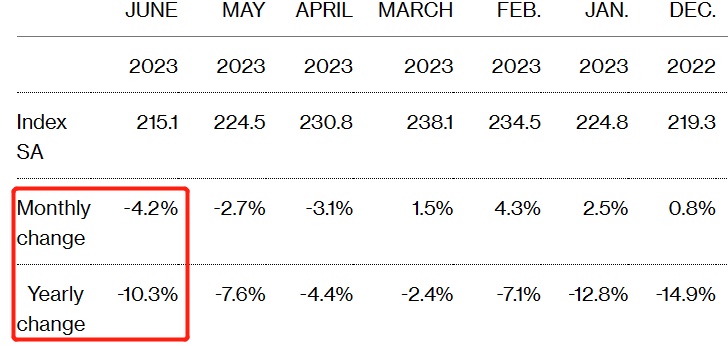 几个月来,二手车价格一直是令美联储政策制定者头疼的问题之一。二手车价格大幅下跌,可能会导致6月份核心通胀率以意料之外的速度大幅下降。Manheim Market Insights的统计数据显示,6月份二手车批发价格较5月份创纪录地下跌4.2%,较2022年6月更是下跌10.3%。二手车价格此前一直是剔除食品和能源价格的核心通胀(核心CPI)的关键驱动因素。