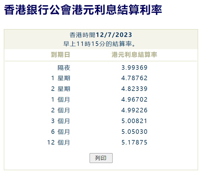 智通财经APP获悉,7月12日,市场憧憬美国6月通胀继续回落,港元拆息普遍走低,仅一个月及一年期上升。隔夜拆息连跌五天,低见3.99369%,跌穿4%水平,反映银行资成本的三个月拆息,亦降至5.00821%,为6月16日以来最低,与同期美元LIBOR息差轻微扩阔至55基点。
