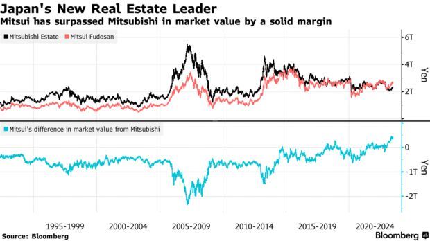 智通财经APP获悉,日本房地产行业出现了新的领军者。据悉,三井不动产(Mitsui Fudosan Co.)的市值在周二升至2.63万亿日元(约合187亿美元),较过去三十年里最大的日本房地产公司三菱地产(Mitsubishi estate Co.)的市值高出3616亿日元,成为日本最有价值的房地产开发商。
