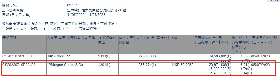 智通财经APP获悉,香港联交所最新资料显示,7月5日,小摩减持赣锋锂业(01772)35.5074万股,每股作价52.0868港元,总金额约为1849.47万港元。减持后最新持股数目约为2387.15万股,最新持股比例为5.91%。