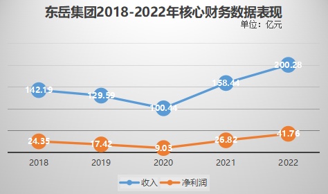 尽管东岳集团的股价在脉冲过后一路下跌,但需要注意的是期间大部分时候公司业绩其实始终保持着强势增长的势头。数据显示,2018-2022年东岳集团的收入分别为142.19亿元(人民币,单位下同)、129.59亿元、100.44亿元、158.44亿元、200.28亿元,同期净利润分别为24.35亿元、17.42亿元、9.03亿元,26.82亿元、41.76亿元。可见,过去两年间正是东岳集团业绩连上台阶的时间窗口期。