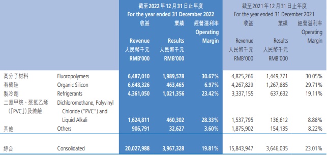 根据公司2022年的财报,拆分结构来看,东岳集团的收入主要来源于高分子材料、有机硅、制冷剂,以及二氯甲烷、聚氯乙烯和烧碱。2022年,上述产品分别实现收入64.87亿元、66.48亿元、43.61亿元以及16.25亿元,对应收入占比32.39%、33.2%、21.77%、8.11%。