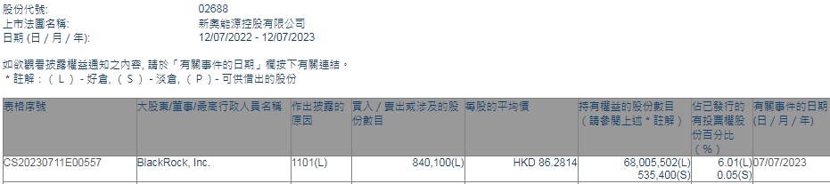 智通财经APP获悉,香港联交所最新资料显示,7月7日,贝莱德增持新奥能源(02688)84.01万股,每股作价86.2814港元,总金额约为7248.50万港元。增持后最新持股数目约为6800.55万股,最新持股比例为6.01%。