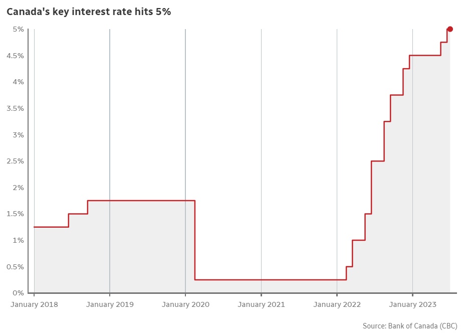 智通财经APP获悉,周三,加拿大央行宣布将基准利率上调25个基点,符合市场预期,这是该国自2001年4月以来基准利率首次达到5%。