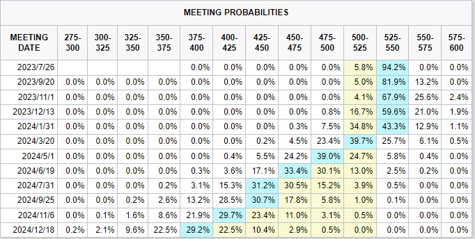 根据CME发布的“美联储观察”数据,在7月会议中,美联储维持利率在5.00%至5.25%不变的概率为5.8%,而加息25个基点至5.25%至5.50%区间的概率则高达94.2%。