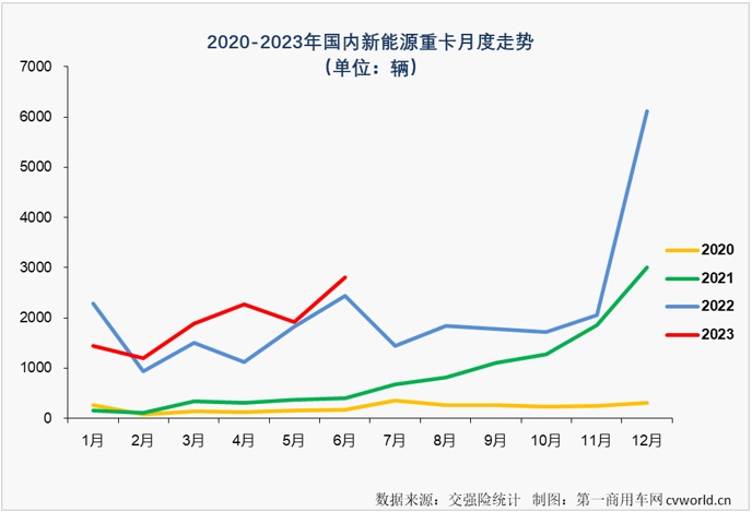 6月份新能源重卡市场2801辆的销量较5月份有近900辆的提升,创造了今年上半年新能源重卡市场的最高月销量。
