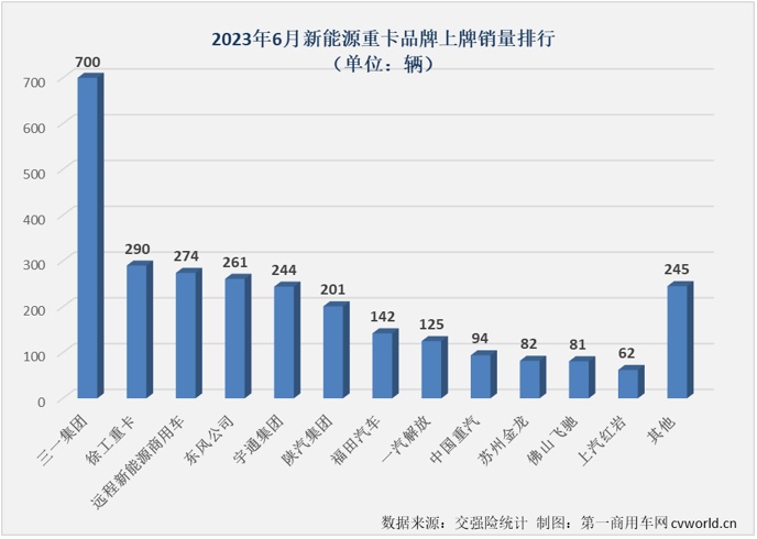 三一以700辆的表现蝉联新能源重卡月销量榜冠军,三一在今年新能源重卡市场已实现“四连冠”,700辆的销量也创造了今年三一新能源重卡最高单月销量;徐工、远程、东风和宇通分列2-5位,销量均在240-290辆区间,差距很小;陕汽以201辆的销量位列月榜第6位;福田和解放两家企业6月份销量也双双破百,分别达到142辆和125辆,分列月榜第7、8位,差距同样不大;排名月榜第9位的重汽也有接近百辆的销量,销售了94辆。