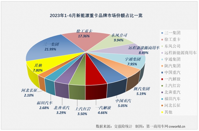 从市场份额看,2023年1-6月,三一新能源重卡累销2532辆列行业首位,累计份额达到21.99%,是唯一一家累计销量超过2000辆的企业,较上年同期提升8.11个百分点,值得一提的是,三一2532辆的累计销量有约70%是最近3个月完成的,势头非常猛;徐工新能源重卡以17.36%的累计份额紧随其后暂列第二位,今年1-6月累计销售新能源重卡1998辆,较上年同期提升3.7个百分点,三一和徐工也是目前仅有的两家累计销量超过1500辆、累计份额超过10%的企业;东风、远程和宇通三家企业累计销量都在1000辆左右,分列3-5位,在2023年1-6月的新能源重卡市场分别抢到9.94%、8.49%和7.95%的份额,但这三家企业在今年1-6月新能源重卡市场的份额较上年同期均有不同程度下滑。排名6-8位的陕汽、重汽和解放累计销量均超500辆,累计份额分别为5.19%、5.05%和4.66%;红岩、北奔和福田等3家企业累计销量均超300辆,今年1-6月累计份额分别为3.5%、3.29%和2.68%,分列9-11位;排名第12位的河北长征累计销量也超过200辆,达到242辆,累计份额为2.1%。