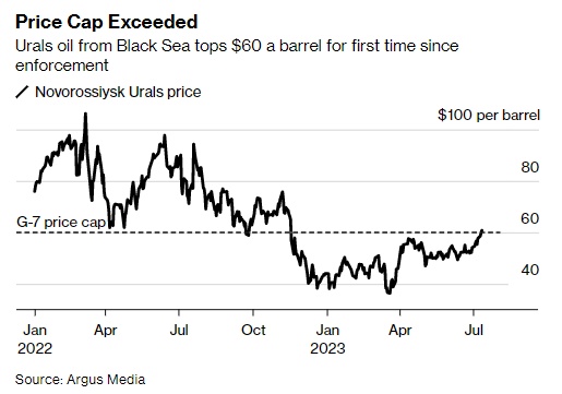 据价格报告机构Argus Media的数据显示,乌拉尔原油价格周三突破每桶60美元,超过了G7去年为限制俄罗斯收入而设定的上限。