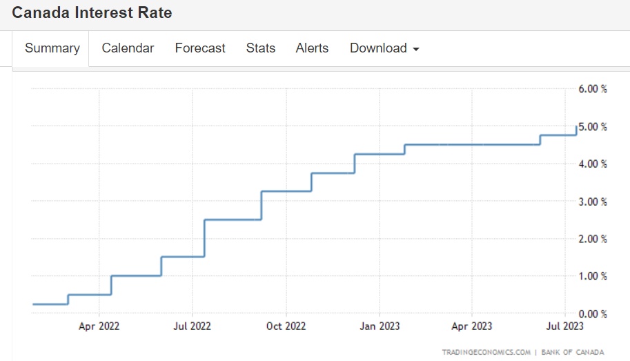 智通财经APP获悉,加拿大央行连续两次会议加息,为进一步加息敞开了大门,誓要将通货膨胀率拉回2%目标。周三,以加拿大央行行长麦克勒姆(Tiff Macklem)为首的央行政策制定者们将隔夜贷款利率上调了25个基点,至5%,为22年来的最高水平。一项调查显示,大多数经济学家都预料到了这一举动,市场认为加息的可能性在四分之三左右。在今年7月宣布加息之前,加拿大今年以来仅加息了2次(1月与6月,幅度为25个基点),在3月与4月暂停加息。