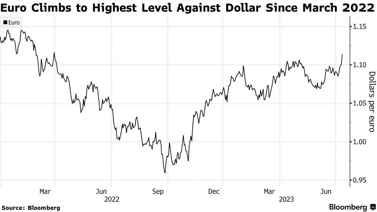 智通财经APP获悉,在欧元兑美元汇率升至2022年3月以来的最高水平后,华尔街策略师正在重新调整他们的外汇投资建议。德意志银行和野村证券均表示,在周三公布的美国通胀数据低于预期,导致交易员减少了对美联储加息的押注后,欧元在经历了五天的上涨后有更大的上涨空间。