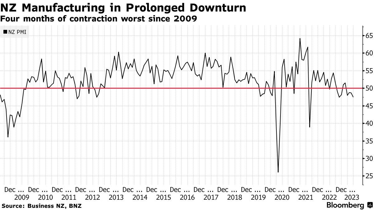 智通财经APP获悉,最新统计数据显示新西兰制造业已连续四个月收缩,这是自2009年以来经历最长时间的制造业衰退期。新西兰商业集团和新西兰银行(BNZ)周四表示,新西兰制造业表现指数(The Performance of Manufacturing Index,简称PMI)从5月份的48.7降至6月份的47.5,6月份数据为去年11月以来最低数值。该指数在今年1月和2月小幅高于50,3月和4月,以及5月和6月连续四个月低于50荣枯线,表明新西兰经济陷入困境。