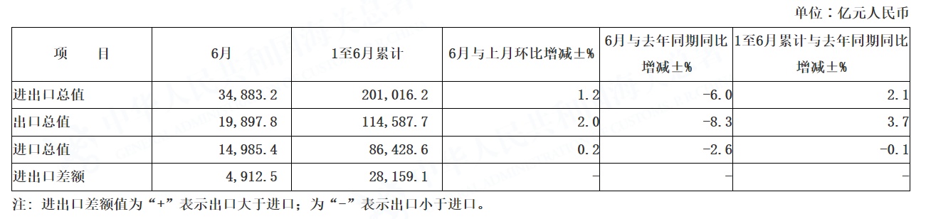智通财经APP获悉,7月13日,海关总署发布2023年6月全国进出口总值表(人民币值)。数据显示,以美元计价,中国6月份出口同比下降12.4%,6月份进口同比下降6.8%,6月贸易顺差706.2亿美元。以人民币计价,中国6月份出口同比下降8.3%,6月份进口同比下降2.6%,6月贸易顺差4912.5亿元。
