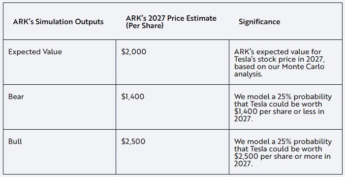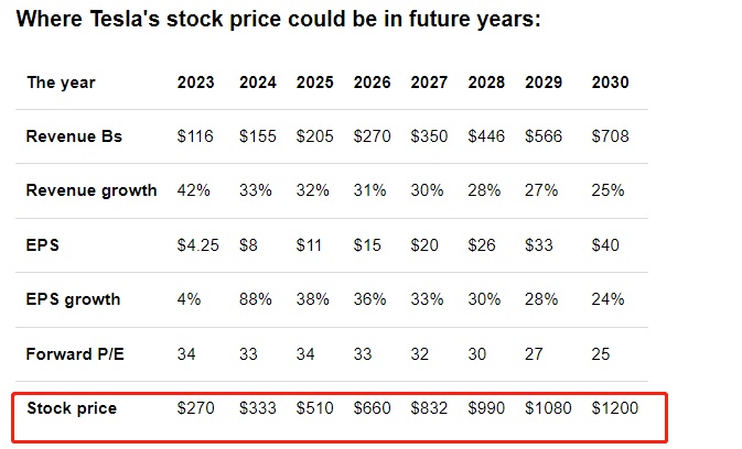 Seeking Alpha的资深分析师 Dergunov并不是唯一看好特斯拉股价破千的投资界人士。长期以来一直看好特斯拉的“木头姐”Cathie Wood曾预计随着自动驾驶出租车以及特斯拉AI技术的蓬勃发展,特斯拉股价有可能在五年内达到2000美元。具体来说,“木头姐”创立并担任首席执行官的ARK投资管理公司预测在牛市情况下,该股股价将为2500美元;在熊市情况下,该股股价将为1400美元。