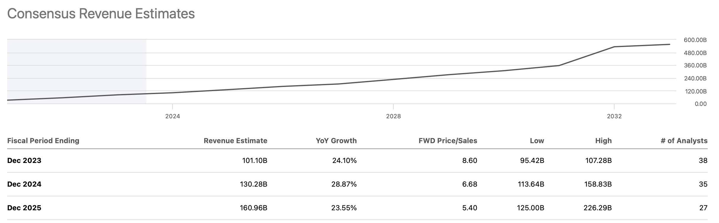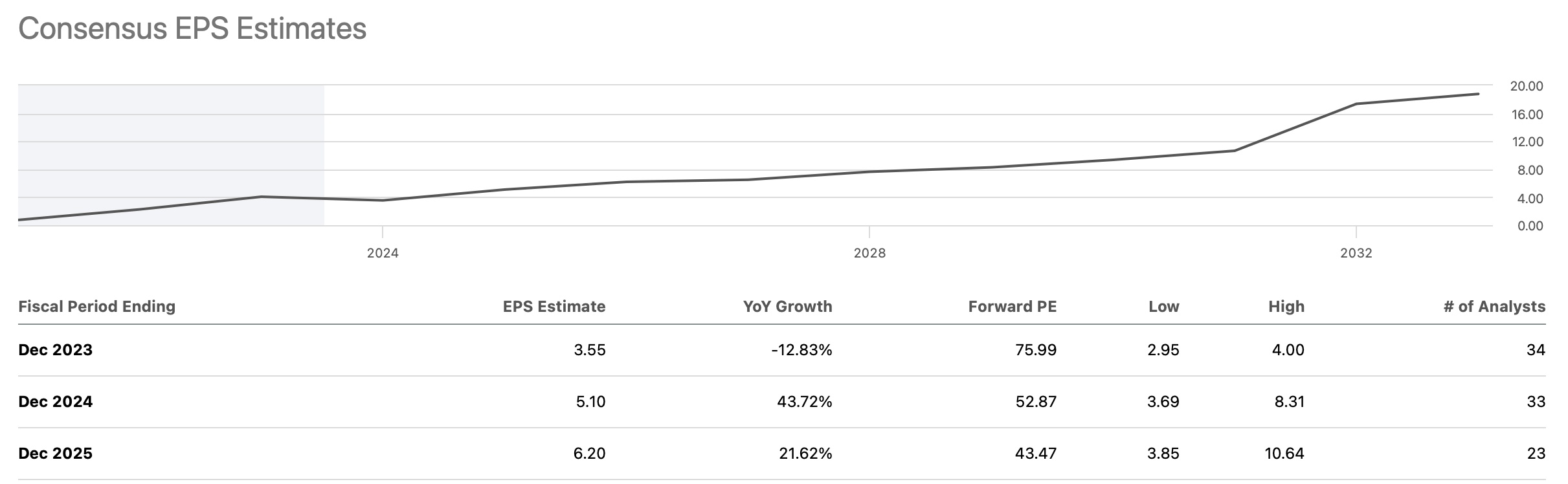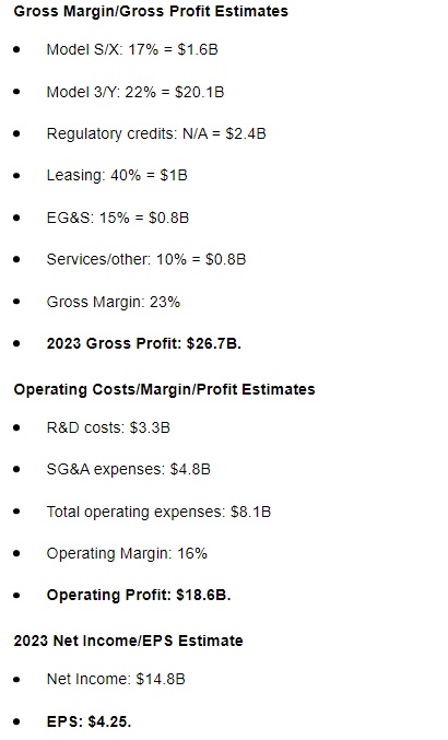 在经济放缓的过程中,今年特斯拉业绩的普遍预期大幅缩水。市场对特斯拉2023年每股收益的普遍预期仅为3.55美元,同比下降13%。这一超低估值也意味着,特斯拉的市盈率约为76x。然而,分析师Derguno对特斯拉2023年每股收益的预期是4.25美元,营收约为1165亿美元。因此,特斯拉今年的市盈率可能在64倍左右,其营收增长可能远远超过分析师社区的普遍预期。