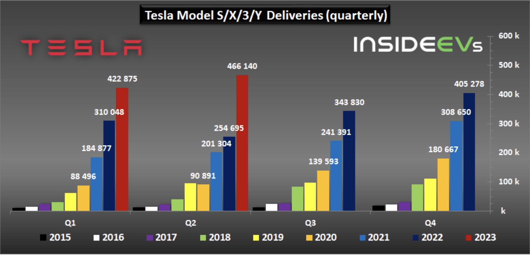 最新数据显示,在美联储高利率重压以及消费支出压力下,特斯拉第二季度交付量仍超过分析师普遍预期的44.5万辆,达到466,140辆,同比增幅达惊人的83%。其中,价格较低的Model 3轿车和Model Y跨界车在本季度交付了446,915辆,市场预期为430,000辆。特斯拉公布的季度产量同样创下历史新高,高达47.97万辆,市场预期则为45.7万辆,并且产销缺口较上一季度明显收窄。