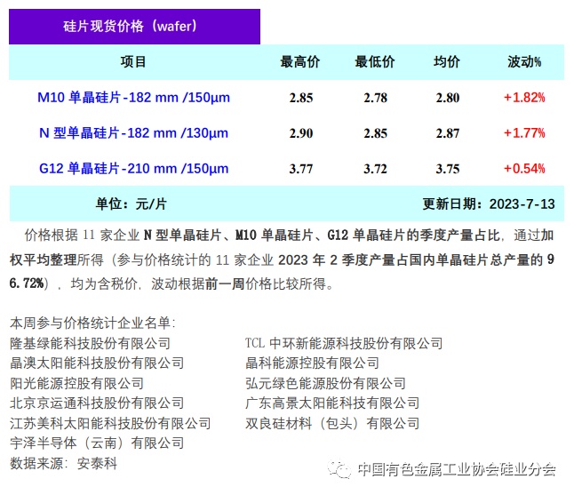 /130μm)成交均价为2.87元/片,周环比增幅1.77%;G12单晶硅片(210