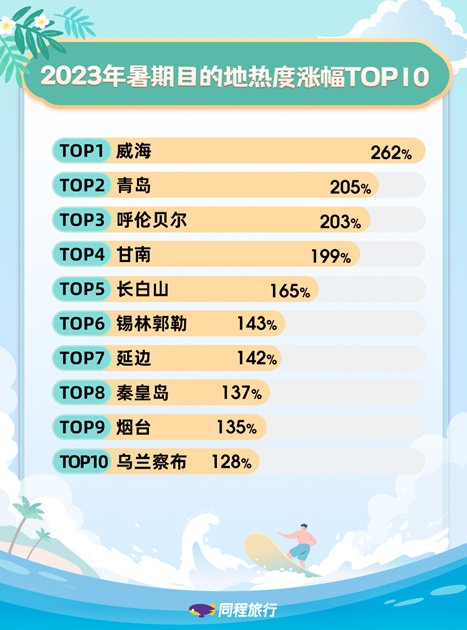 同程旅行数据显示,2023年暑期,国内热门的看海目的地包括青岛、厦门、舟山、三亚、大连。作为暑期热门的品牌节事活动,7月14日即将开始的青岛国际啤酒节,带动青岛旅游热度上涨205%。此外,威海暑期旅游热度涨幅达到262%,成为国内暑期热度涨幅最高的旅游目的地。