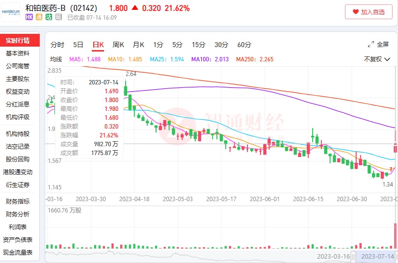 智通财经APP了解到,和铂医药在今年年初达到区间高点3.91港元后股价便持续下跌,7月7日盘中,其股价触及低点1.34港元,创下今年以来股价新低,区间跌幅达到65.73%。