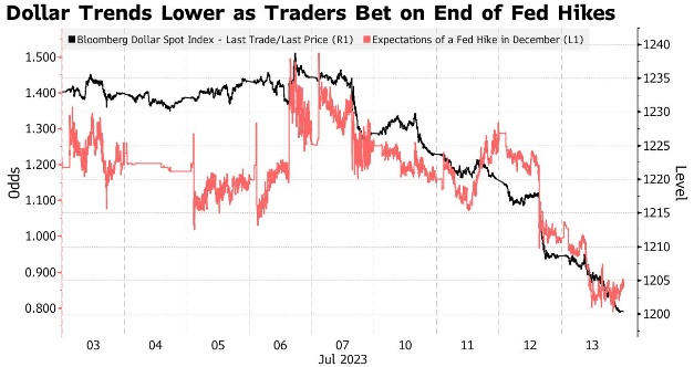 尽管7月份加息几乎仍是板上钉钉的事,但价格涨幅的迅速回落——目前仅为2022年峰值水平的三分之一——给人们带来了新的希望,即美联储可能很快结束紧缩周期。交易员目前认为,美联储在7月之后选择进一步加息的可能性不到50%。