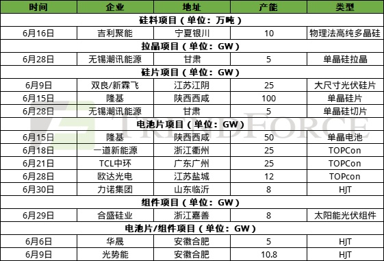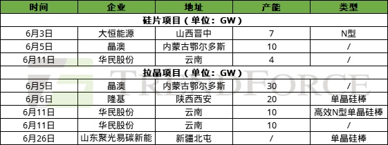 投产项目:6月投产项目共计10个,主要集中在拉晶、硅片、组件环节