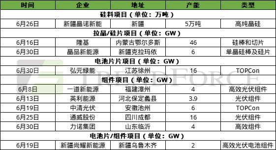 硅料环节,6月仅有新疆晶诺一期年产5万吨高纯晶硅项目投产。