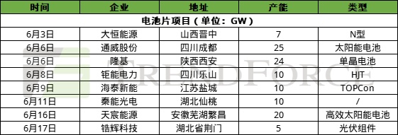 签约项目:6月签约持续火爆,主要集中在电池片、组件环节