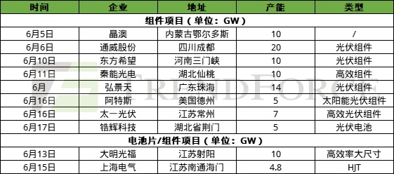 组件环节,6月仅有合盛硅业年产8GW太阳能光伏组件生产项目开工。
