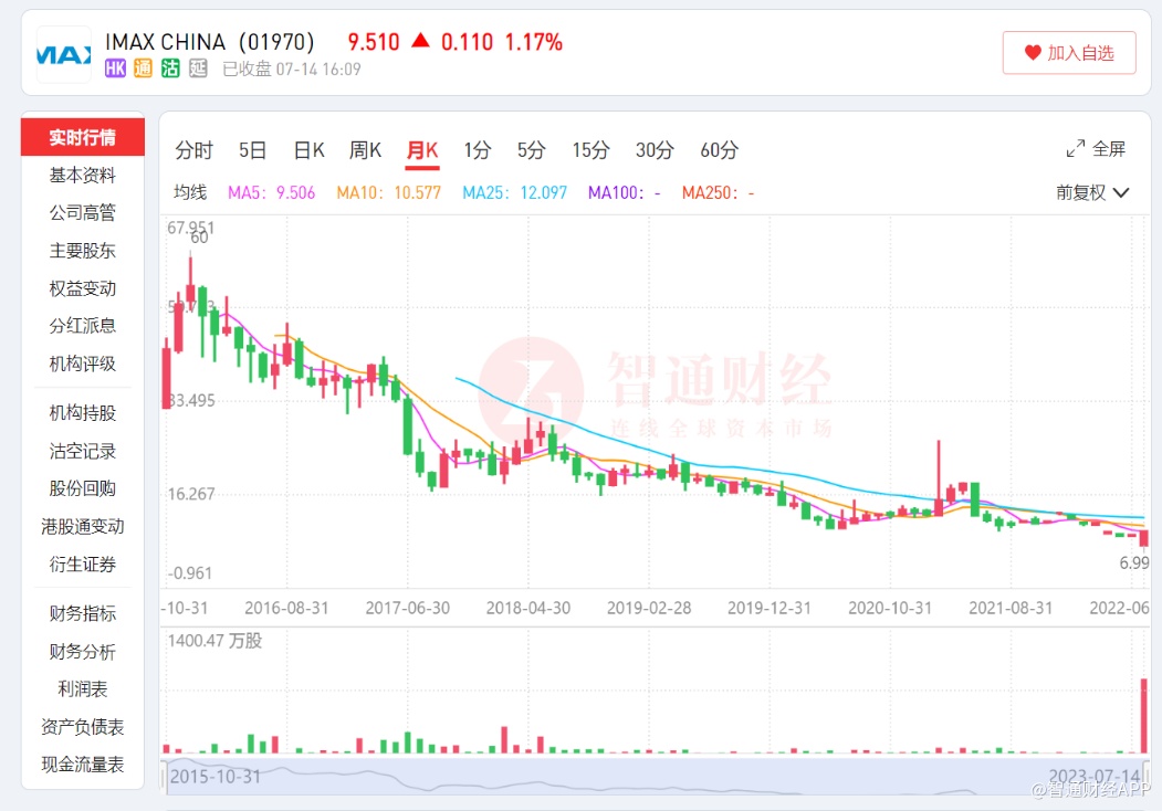 2022年11月,IMAX中国的股价一度下探至3.883港元,较历史最高点跌幅超过93%。2023年7月14日,IMAX中国股价报收于9.51港元,较历史高点仍有83.7%的跌幅。
