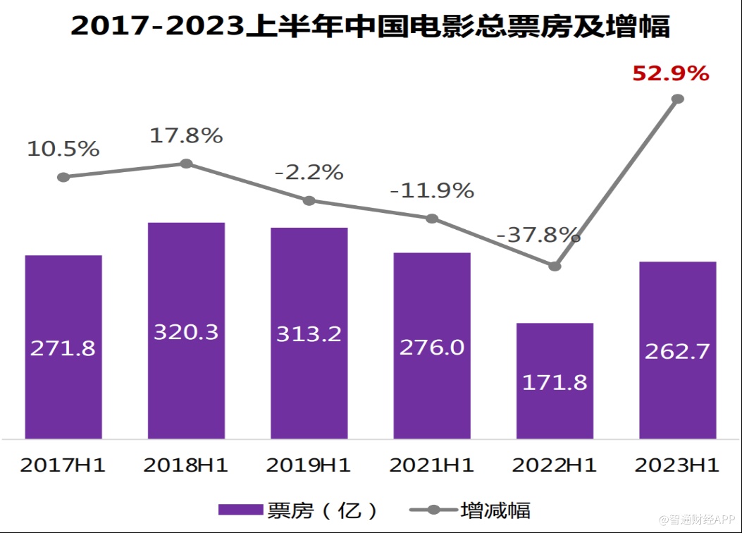 进入2023年,消费呈现复苏态势,电影行业也在坚实的基本盘之下快速恢复元气。根据艺恩报告,2023上半年中国电影市场票房达到262.7亿,同比增长52.9%;上半年影院放映场次达6286万场,同比增长22.4%,基本回到了2021年同期水平;上半年上映影片数量较2022年同期增加81部,与2021年持平,其中国产片数量增长50.0%,进口片数量增长66.7%;