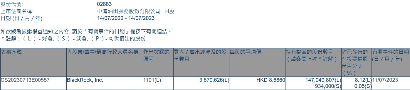 智通财经APP获悉,香港联交所最新资料显示,7月11日,贝莱德增持中海油田服务(02883)367.0626万股,每股作价8.6860港元,总金额约为3188.31万港元。增持后最新持股数目约为1.47亿股,最新持股比例为8.12%。