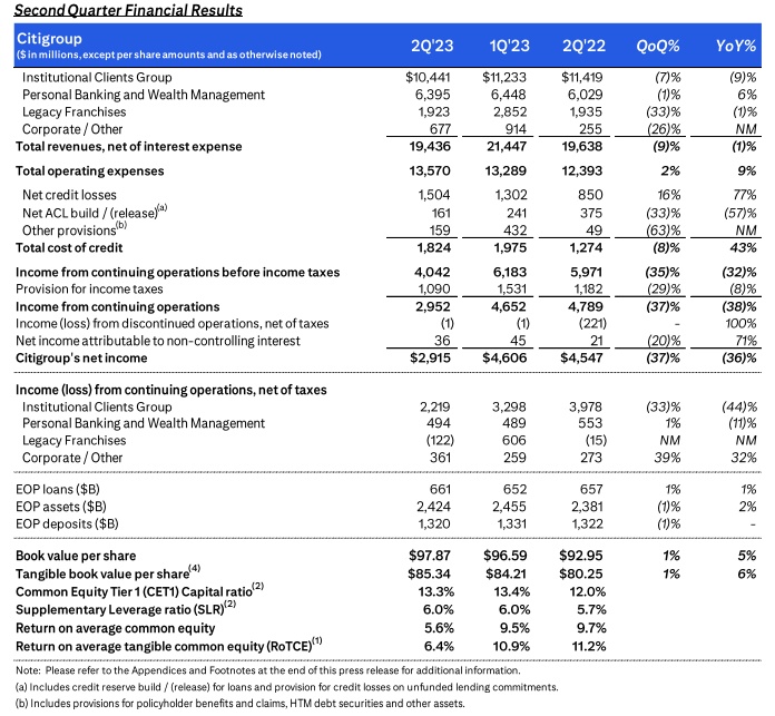 智通财经APP获悉,7月14日美股盘前,花旗(C.US)公布了2023年第二季度财务业绩。数据显示,Q2营收为194.4亿美元,同比下降1%,较市场预期高出1.2亿美元。非GAAP每股收益为1.37美元,与预期一致。每股收益为1.33美元,同比下降39%,但高于市场预期的1.30美元。受支出增加、信贷成本高企、市场业务收入和投行业务收入下降的影响,花旗Q2净利润同比暴跌36%至29.15亿美元。