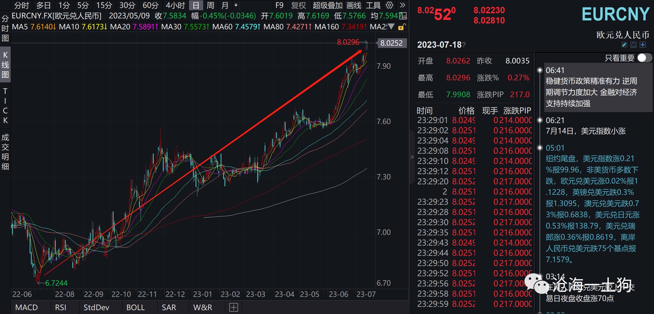 如上图所示,自2022年6月以来,欧元一直在对人民币升值,底部以来升值了20%。