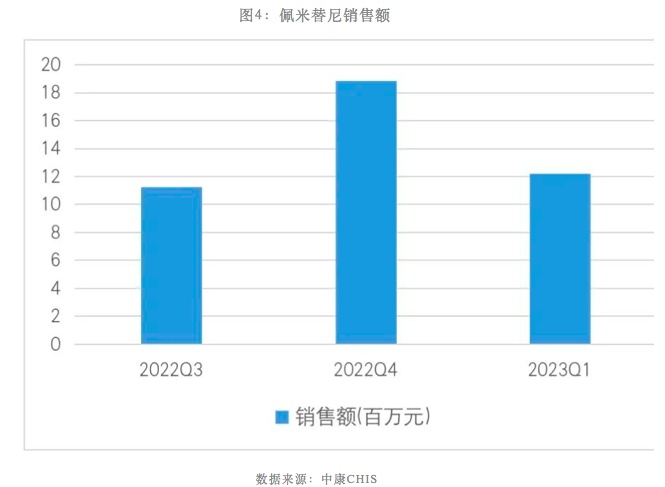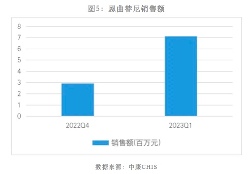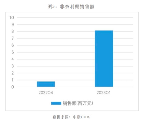 拜耳公司财报显示,2023年第一季度非奈利酮的销售额为5200万欧元(约5700万美元),同比增长372%。中康CHIS数据也显示,非奈利酮在2023年第一季度被纳入医保后,销量开始大幅增长。拜耳公司已在中国的糖尿病领域深耕多年,对于此类药物的商业化具有显著优势。预计今年下半年,非奈利酮的销量将持续增长。