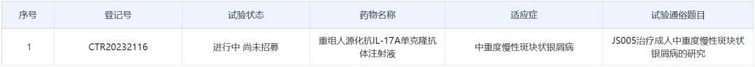 根据君实生物早前发布的新闻稿,JS005是一种重组人源化抗IL-17A单克隆抗体,它通过与IL-17A高亲和力结合,并选择性地阻断IL-17A与其受体IL-17RA/IL-17RC的结合,从而阻断下游信号通路的激活和炎性因子的释放,进而起到缓解自身免疫性疾病患者症状的作用。君实生物2022年度业绩报告显示,JS005分别针对中重度银屑病和强直性脊柱炎的两项2期临床研究已完成锁库揭盲,疗效结果达到预期,安全性良好。