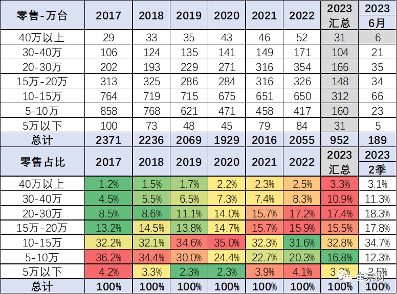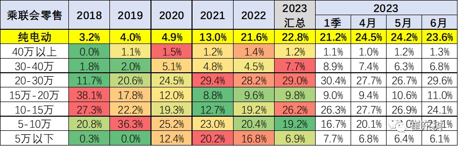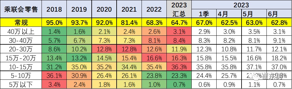 智通财经APP获悉,7月16日,乘联会秘书长崔东树发文称,根据乘联会数据,全国乘用车市场价格段销量结构走势持续上行,高端车型销售占比提升明显,中低价车型销量占比减少,这是消费升级的推动,同时也是因为2021年以来的芯片缺损带来的主力车型供给不足的结构性损失。2023年进一步强化车市结构高端化的特征。