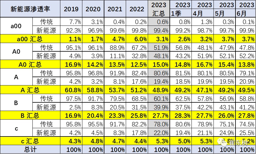 新能源车渗透率最高的是小车,微型车渗透率100%,A0级小型车近50%,且A0级的新能源提升特别快。