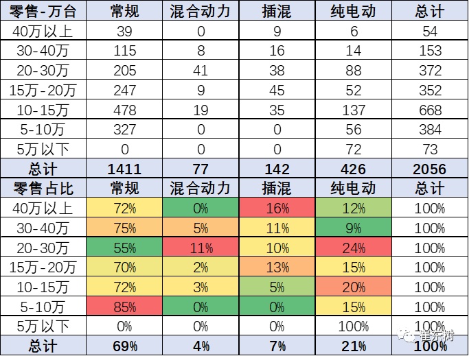 传统车与新能源车中差异比较大,而在插电混动中的结构是相对中档集中的。