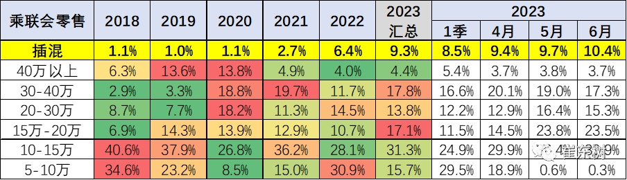 混动的车市份额也是在持续提升,但2022年的供给改善,导致份额逐步提升。今年的市场需求转向插混,混动的市场表现一般。
