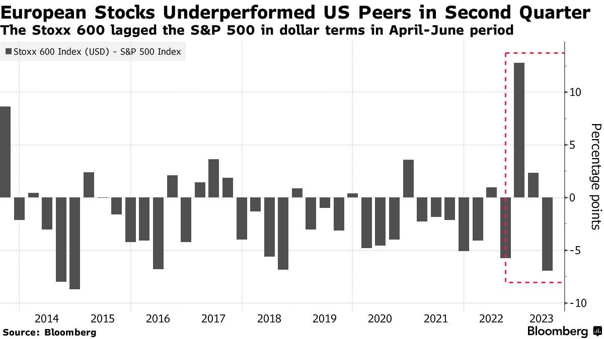 今年4月至6月期间,欧洲斯托克600指数以美元计算的表现落后于标准普尔500指数,股市开始反映出欧洲面临的挑战。虽然较低的估值使欧洲股市对一些人来说再次具有吸引力,但其他人表示,欧洲股市缺乏科技股可能会使其前景保持动荡。