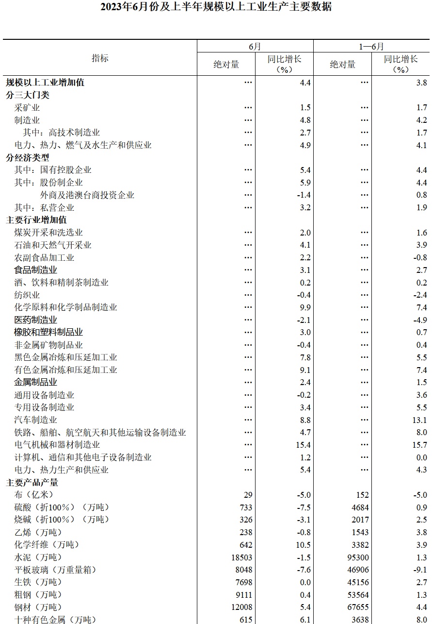 智通财经APP获悉,7月17日,国家统计局数据显示,上半年,规模以上工业增加值同比增长3.8%(增加值增速均为扣除价格因素的实际增长率)。6月份,规模以上工业增加值同比实际增长4.4%。