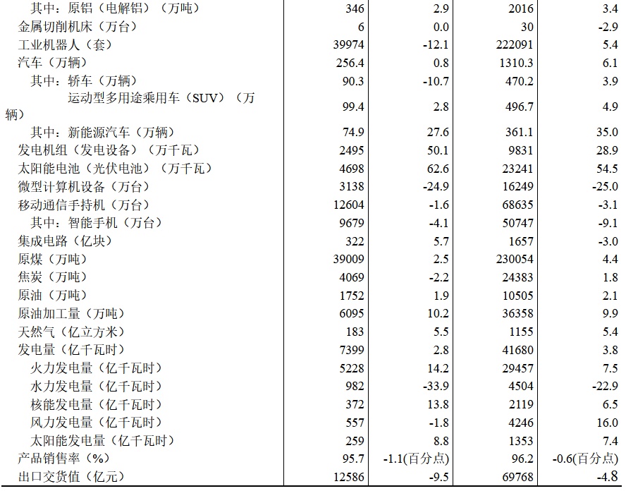 分产品看,上半年,620种产品中有331种产品产量同比增长。钢材67655万吨,同比增长4.4%;水泥95300万吨,增长1.3%;十种有色金属3638万吨,增长8.0%;乙烯1543万吨,增长3.8%;汽车1310.3万辆,增长6.1%,其中新能源汽车361.1万辆,增长35.0%;发电量41680亿千瓦时,增长3.8%;原油加工量36358万吨,增长9.9%。